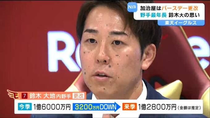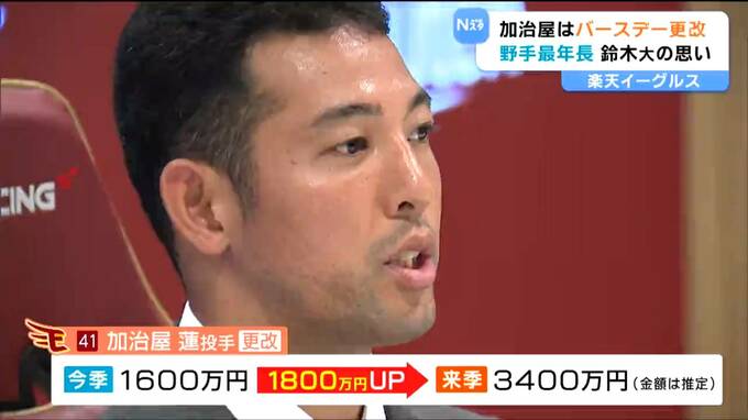 25日が34歳の誕生日だという加治屋投手は、1800万円アップの推定3400万円でサイン。