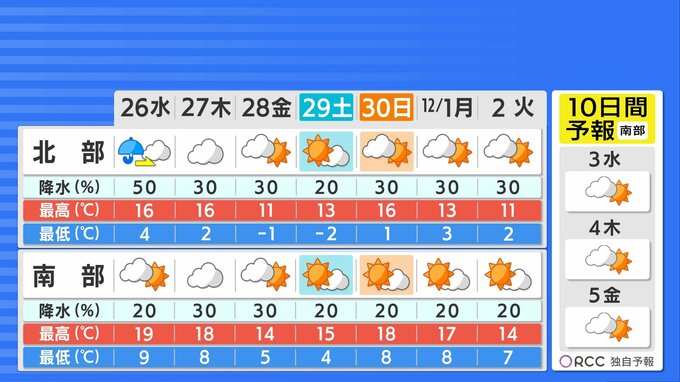 【あす11/26(水)広島天気 】南部ほどよく晴れる 明け方まで黄砂に注意 昼間はぽかぽか陽気 中国放送 2025年11月25日(火) 19:02 国内 天気 木曜・金曜 再び黄砂飛来か 一日の寒暖差に注意 日中の気温は、平年並から平年より高い日が続き、昼間は日差しが暖かく、過ごしやすい日が多いでしょう。ただ、引き続き朝晩の冷え込みは強く、一日の寒暖差が大きいですので、体調を崩さないようご注意ください。