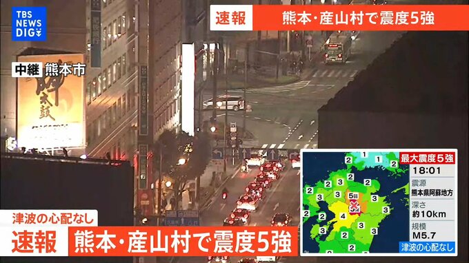 18時01分頃の地震 津波の心配はありません震源は熊本県阿蘇地方深さは約10km 規模はM5.7震度5強 産山村震度5弱 阿蘇市 竹田市震度4 菊池市 南小国町 熊本高森町 西原村 南阿蘇村震度3 八幡浜…