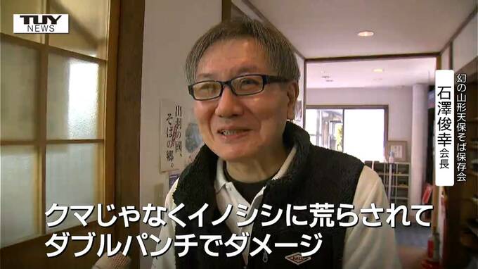 幻の山形天保そば保存会 石沢俊幸 会長「高温障害が出てしまって、ずいぶん収量が落ちました。それとクマじゃなくイノシシに荒らされて、ダブルパンチでダメージ」