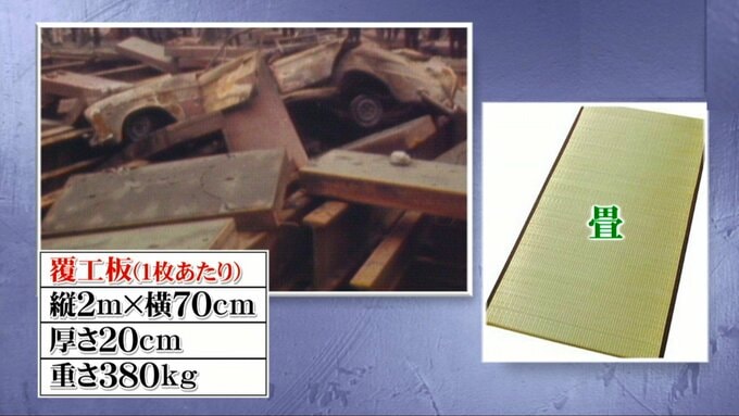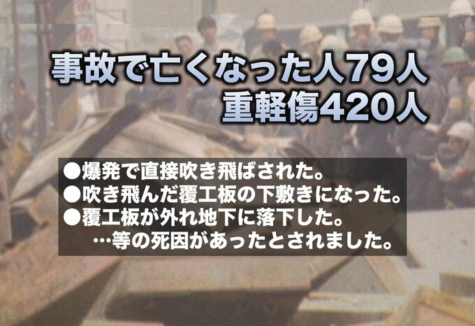 凄まじい衝撃音とともに道路が持ち上がり「覆工板」と呼ばれる鉄板約1500枚が空中へ舞い、四方へ飛散しました。その総重量は600トンを超えていたと言われています。