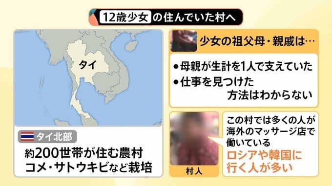 また、私たちはこの村に住んでいる方にも取材をしました。その村人の一人から、「この村では多くの人が海外のマッサージ店で働いている。ロシアや韓国に行く人が多い」という気になる証言を得ました。