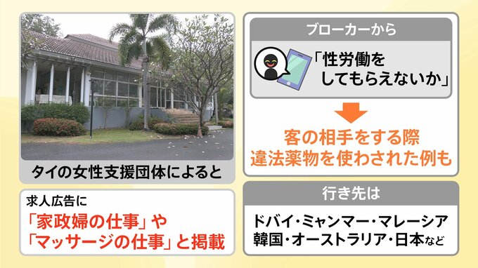 支援団体によると、タイのSNSには「家政婦の仕事」や「マッサージの仕事」ということで、多くの海外の出稼ぎの求人が掲載されています。