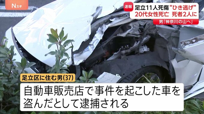 東京・足立区で乗用車が歩行者をはね、11人が死傷したひき逃げ事件。80代の男性に加え、心肺停止だった20代の女性の死亡も確認されました。トラックに追突し、ボンネットが大きくめくれた乗用車。乗っていた男はド…