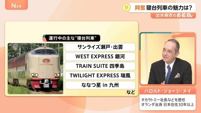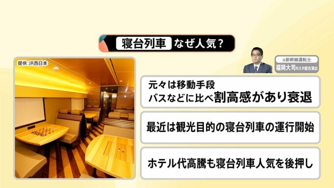 元新幹線運転士で、Nスタ総合演出を務める福岡大司さんに寝台列車の人気の背景を聞きました。「寝台列車は元々は移動手段であり、バスなどに比べ割高感があり衰退していた。しかし最近は観光目的の寝台列車の運行が開始され、ホテル代高騰も寝台列車人気を後押ししているのではないか」ということです。