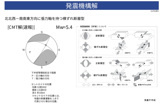 今回の地震は、熊本県阿蘇地方の深さ約9kmで発生しました。発震機構(地震が起きた際の岩盤の動き方)は、北北西—南南東方向に張力軸を持つ横ずれ断層型で、地殻内で発生した地震と考えられています。