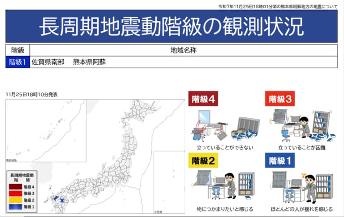 地震発生後、午後7時までの間に震度1以上を観測した地震が9回発生しており、そのうち震度2が5回、震度1が4回観測されています。また、佐賀県南部と熊本県阿蘇では長周期地震動階級1を観測しました。
