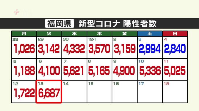 新型コロナウイルスの感染状況です。福岡県では13日、新たに6687人の陽性が確認されました。一日の新規陽性者が6000人を超えたのは9月2日以来です。70代以上の男女5人が亡くなっています。12…