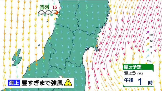 海上では北寄りの風が強まる予想となっています。海上では昼過ぎ、午後3時頃までは北寄りの強風に注意してください。