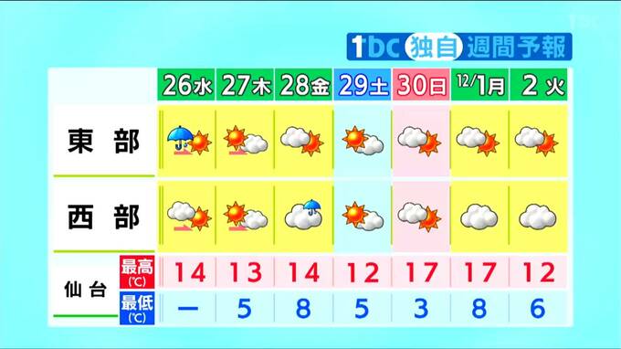 今週末、29日土曜日と30日日曜日は土曜日を中心に晴れ間が広がるでしょう。来週12月1日月曜日と2日火曜日は西部で曇りマークとなっており、にわか雨の可能性があります。