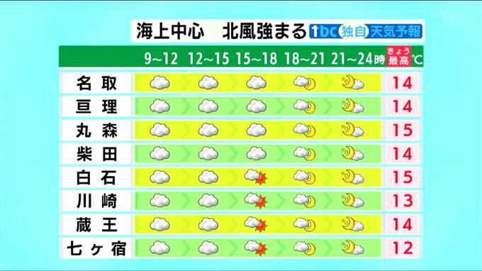 今日の最高気温は14℃の予想で、大体昨日と同じくらいです。ただし、特に海に近いエリアでは北風が強く吹くため、風が体感的に冷たく感じられそうです。