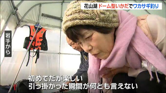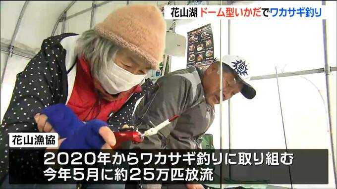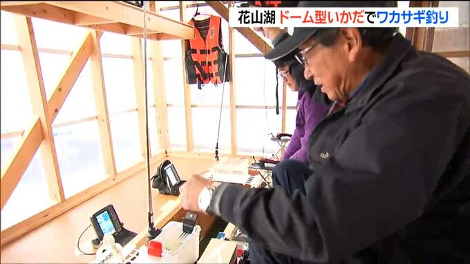 宮城県栗原市の花山湖では、ドーム型のいかだが設置され、連日、県内外から訪れた人たちがワカサギ釣りを楽しんでいます。