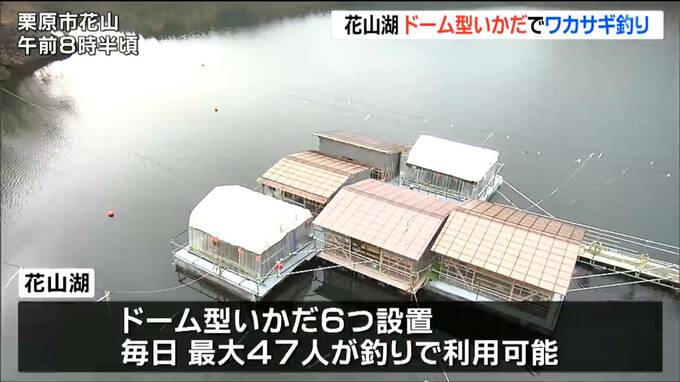 宮城県栗原市花山にある花山湖では、湖の上にドーム型のいかだが6つ浮かべられていて、毎日、最大で47人が釣りを楽しむことができます。