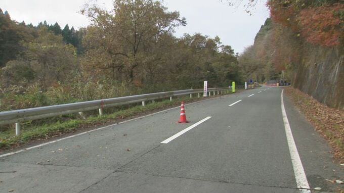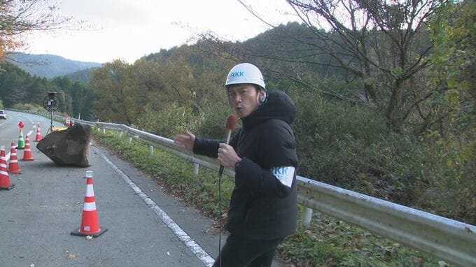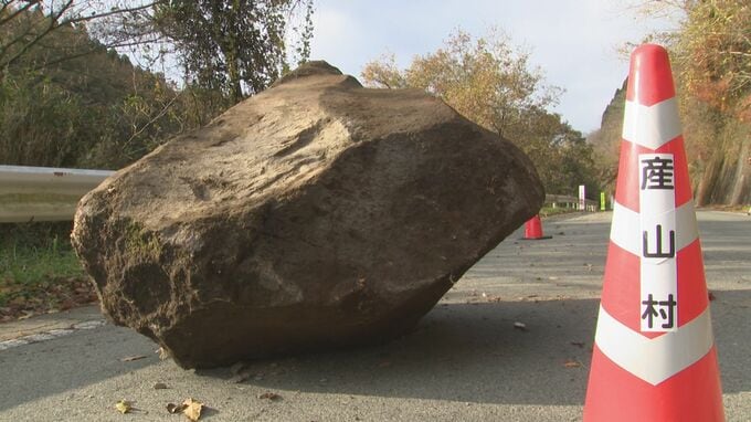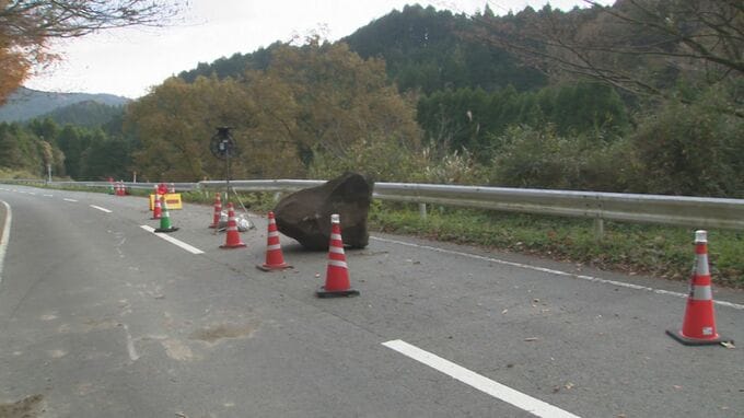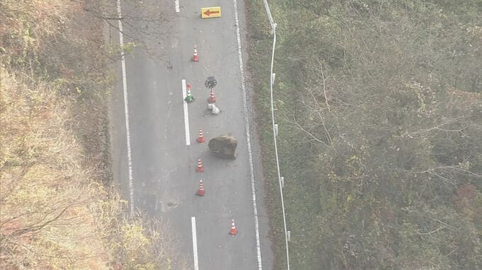 高さ1mほどの岩が県道をふさぎ、通行止めとなっています。警察によりますと、軽乗用車が落石に衝突したものの、けがをした人はいなかったということです。