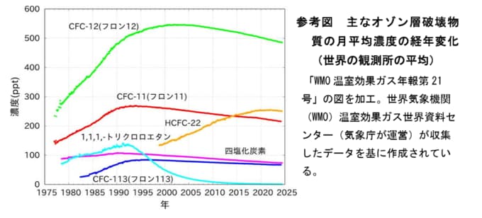 主なオゾン層破壊物質であるCFC-12(フロン12)やCFC-11(フロン11)の濃度は、1990年代をピークに減少傾向にありますが、依然として高い状態です。