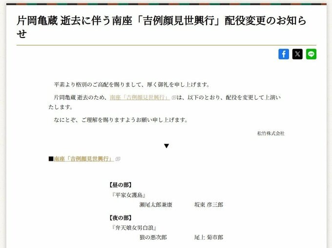 公式HPでは、「片岡亀蔵 逝去に伴う南座『吉例顔見世興行』配役変更のお知らせ」と題し、「片岡亀蔵 逝去のため、南座「吉例顔見世興行」は、以下のとおり、配役を変更して上演いたします」と発表。