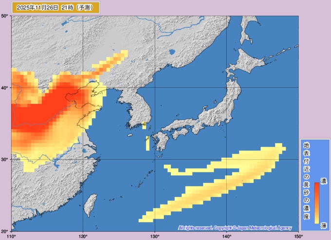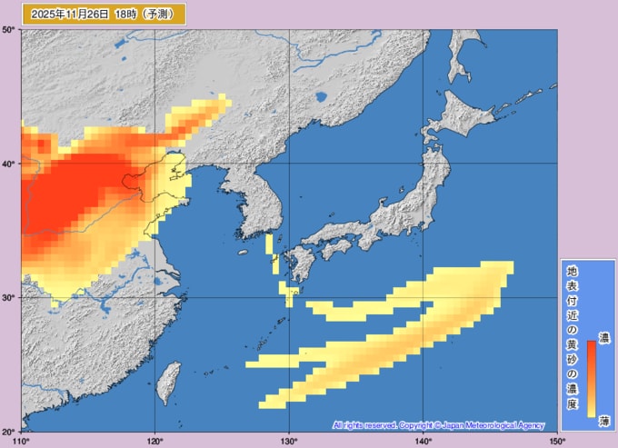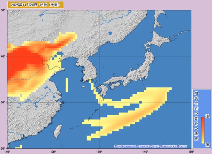 【黄砂情報】九州・中国・四国・近畿に高濃度の黄砂が飛来する可能性 27日夜~28日早朝に西日本中心に“黄砂の影” いつ・どこに飛んでくる?【黄砂の予想シミュレーション・気象庁「黄砂解析予測図」あり】 青森テレビ 2025年11月26日(水) 14:30 国内 【26日(水)】気象庁の黄砂情報「黄砂解析予測図」 ※画像は気象庁HPより ♦黄砂の予想シミュレーション ♦黄砂解析予測図(26・27・28・29) ♦記事を最初から読む