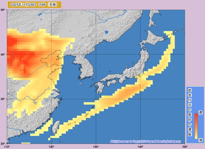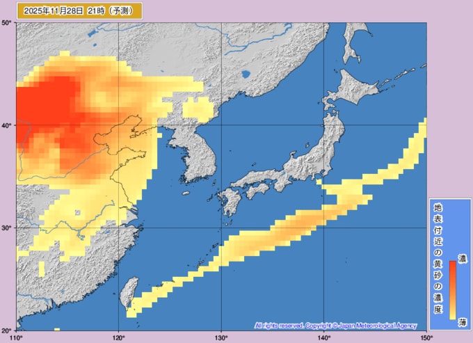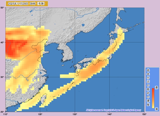 【黄砂情報】九州・中国・四国・近畿に高濃度の黄砂が飛来する可能性 27日夜~28日早朝に西日本中心に“黄砂の影” いつ・どこに飛んでくる?【黄砂の予想シミュレーション・気象庁「黄砂解析予測図」あり】 青森テレビ 2025年11月26日(水) 14:30 国内 【28日(金)】気象庁の黄砂情報「黄砂解析予測図」 ※画像は気象庁HPより ♦黄砂の予想シミュレーション ♦黄砂解析予測図(26・27・28・29) ♦記事を最初から読む