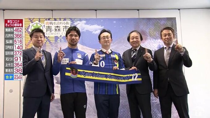 サッカーJFLのラインメール青森は13日青森市役所を訪れ、小野寺市長に今シーズンの成績を報告するとともにJリーグ昇格を目指す来シーズンへの決意を語りました。青森市役所を訪れたのは、ラインメール青森の柴田峡…