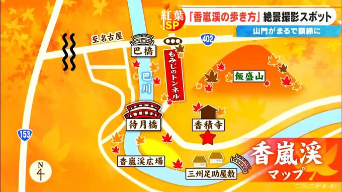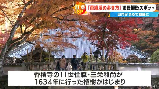「香嵐渓のもみじは約400年前、江戸時代の寛永に三栄和尚という住職がいたが、三栄和尚が一本ずつ手植えしたのが香嵐渓のルーツ」
