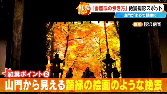 山門と紅葉のコントラストが、まるで額縁の中の絵画のように見える、まさに絶景。
