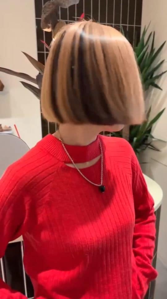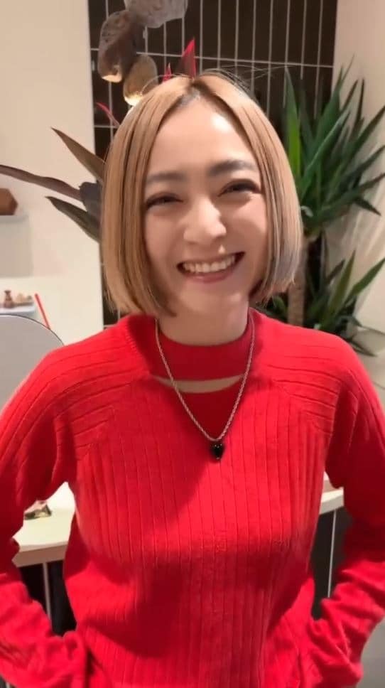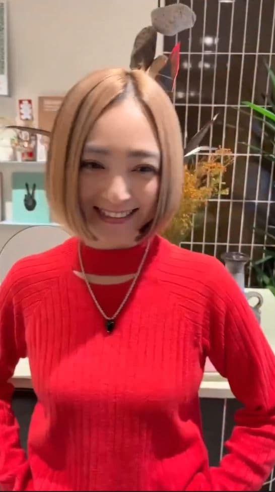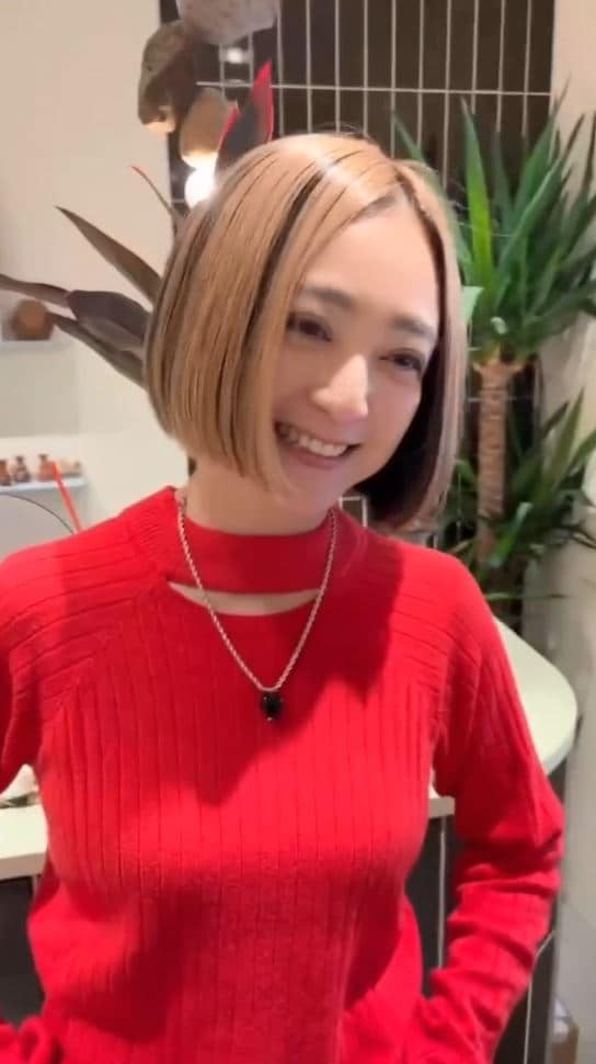安達さんの新しいヘアスタイルは、顎下で整えられたボブカット。内側の髪色は黒く残しているものの、全体的にはベージュ系のブロンドヘアにしており、光を受けて輝く様子が印象的です。前髪は長めで、ライン感のあるカットで、シンプルながらも洗練された印象を与えています。