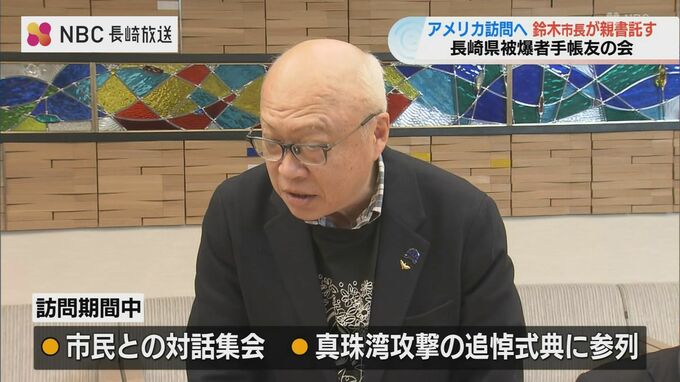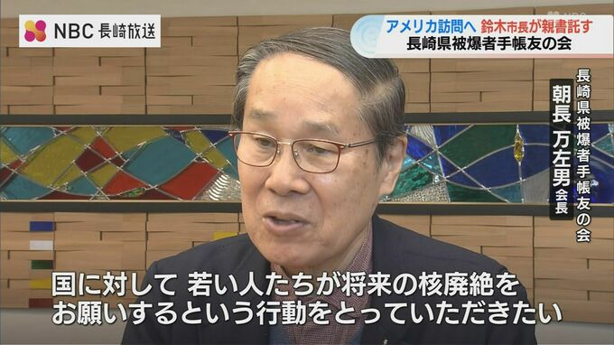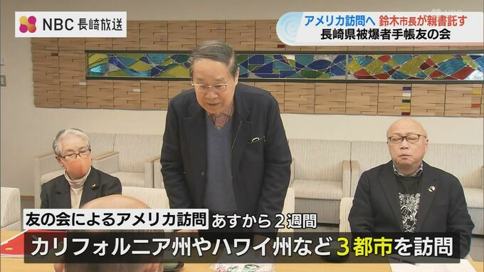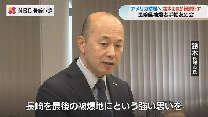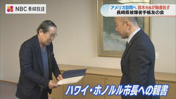 アメリカの市民との交流を目的に11月27日から現地へ向かう長崎の被爆者団体へ、長崎市の鈴木市長から訪問先の市長に宛てた親書が託されました。