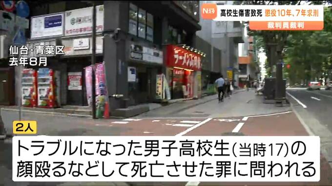 2024年8月、仙台市内の路上で男子高校生に暴行を加え死亡させた罪に問われている男2人の裁判員裁判で検察側は、男2人にそれぞれ懲役10年と懲役7年を求刑しました。