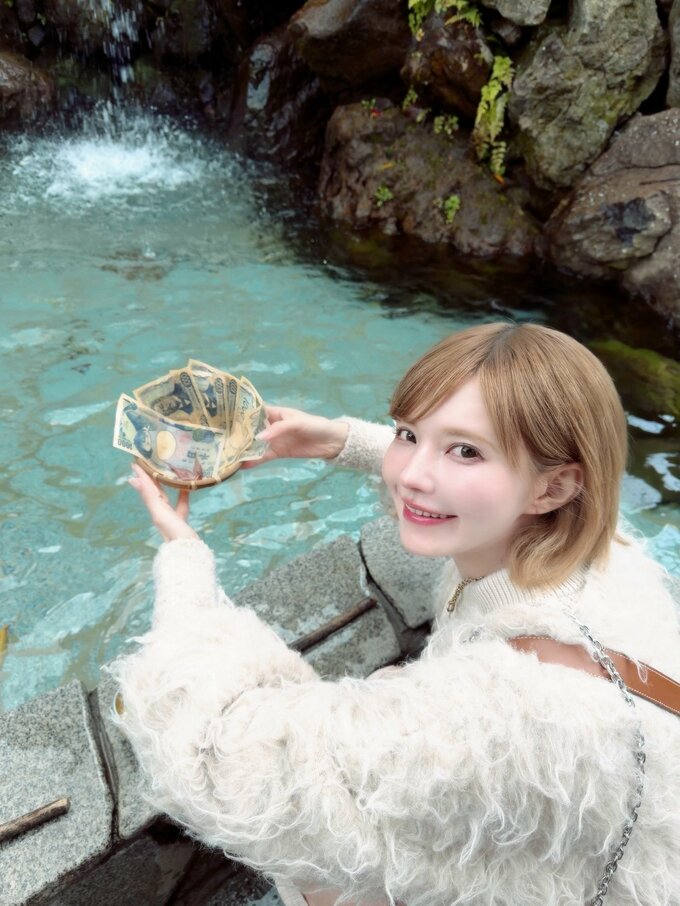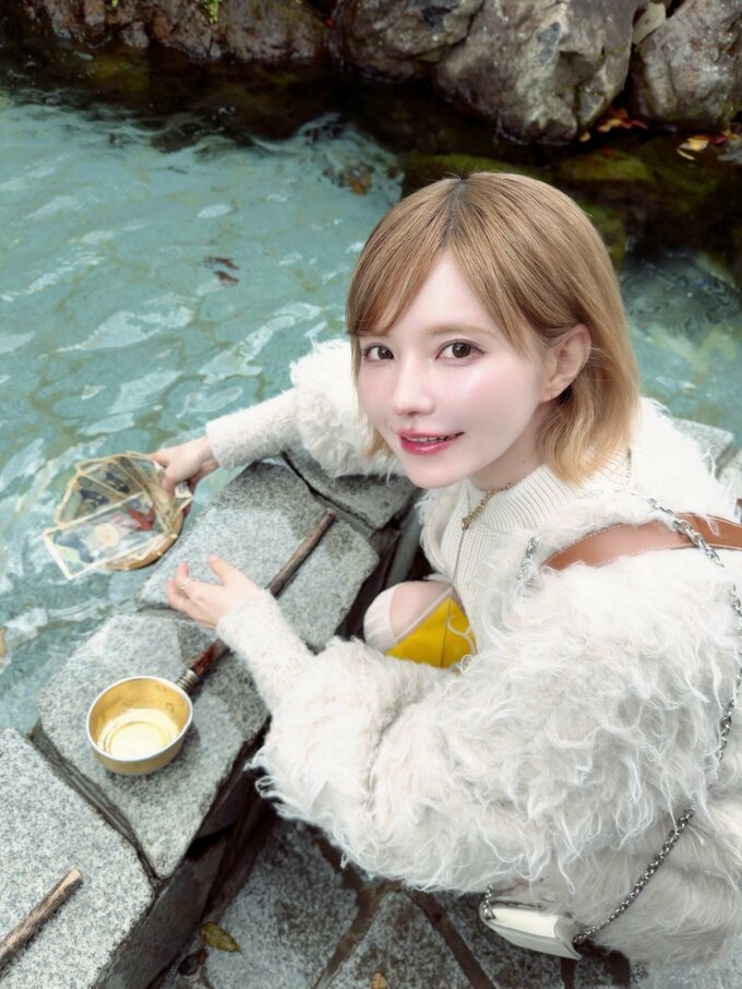 お金を清めることで金運アップを祈願する「銭洗い」を体験し、「1万円札はお賽銭箱に入れるようにしてるから残りの全財産千円札しか入ってなかったけど、しっかり洗って持って帰って干したよー!」と報告しています。