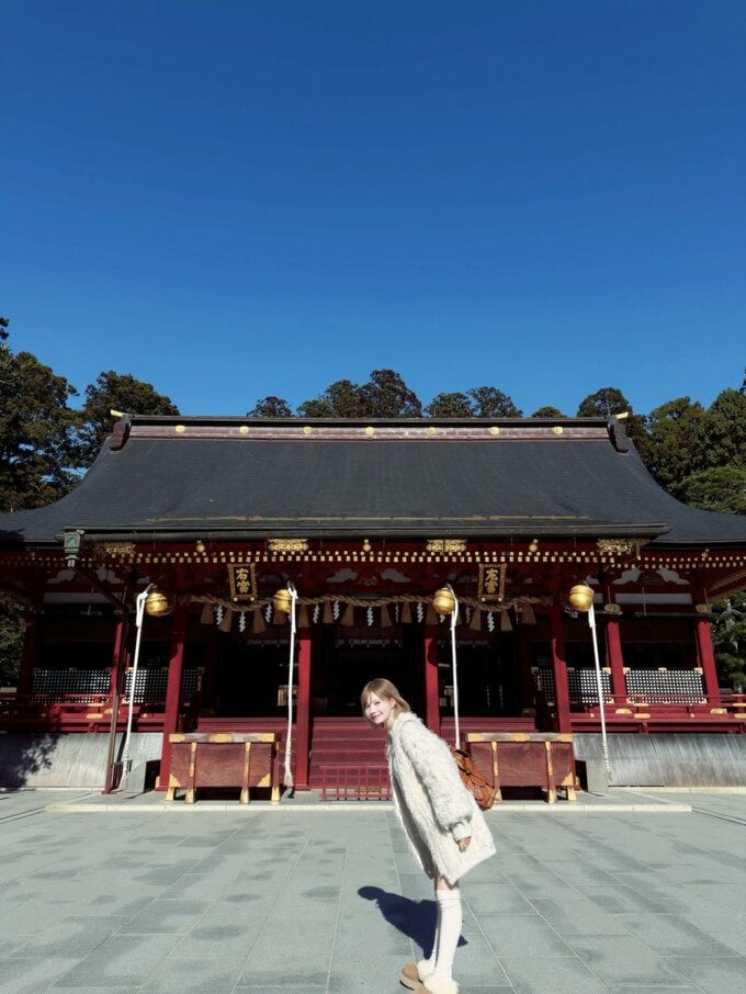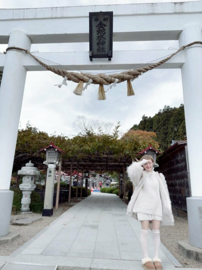 益若さんは「日帰りご利益旅いいな。ハマりそう」と満足げに綴り、「あ、鹽竈神社と蛇水だから白コーデね。神社は黒よりも白めやトーンが綺麗な色で参拝するようにしてます」とファッションにもこだわりがあることを明かしています。