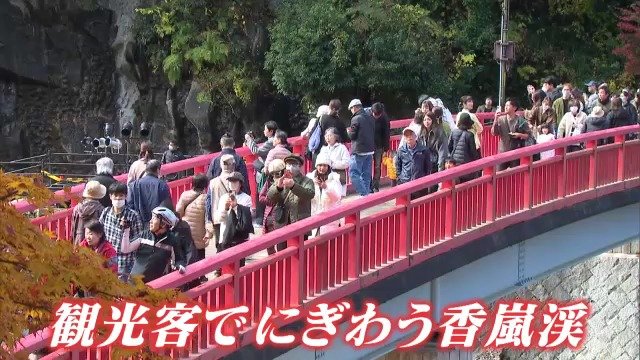 そして、向かった先は…赤い橋の待月橋。見頃を迎え、大勢の観光客で賑わう香嵐渓。