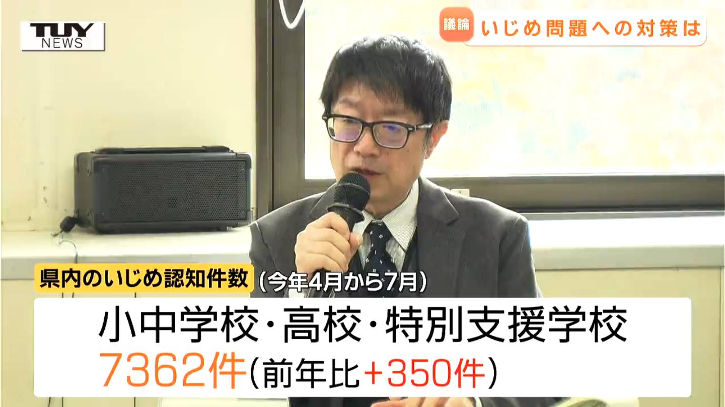 会議では、今年4月から7月までに県内の小中学校、高校、特別支援学校で確認されたいじめの件数が、去年の同じ時期よりも350件多い7362件になったことが報告されました。