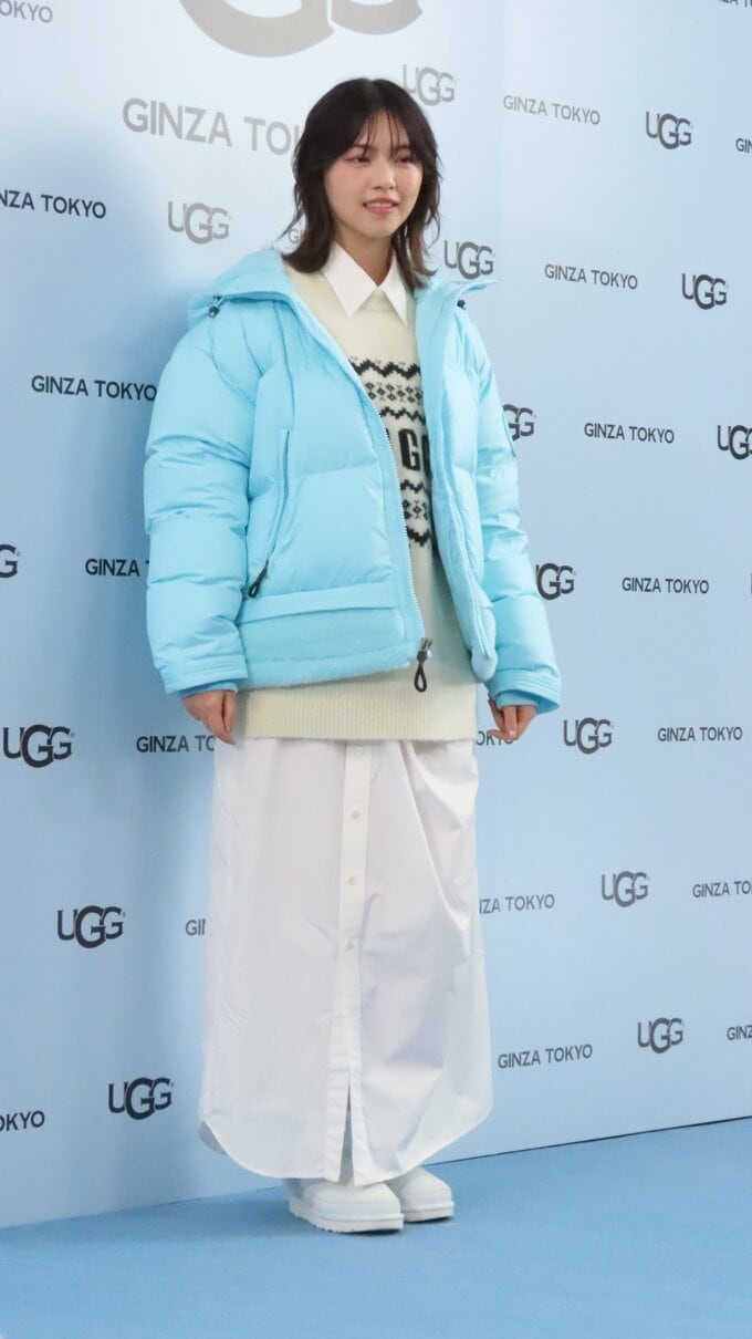 西野さんは、“UGGの今季の押しているカラーがイリュージョンブルーっていう色味で、この今履いているブーツの色味。すごく爽やかで、冬っぽい。ダウンも同じような色で全体的にちょっと雪っぽい感じになってるけど、カジュアルになりすぎないようにシャツワンピを合わせて、カジュアルダウンじゃなくて、カジュアルアップ的な感じになったらいいな”と、淡いブルーが印象的なコーディネートを紹介しました。