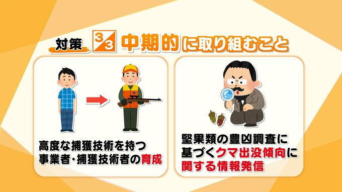 そして3つ目は「中期的に取り組むこと」。主なものとしては(1)クマを捕獲するための高度な技術を持つ人を育成(2)クマのえさとなるブナなどが豊作か凶作かを調査することによる出没傾向などの情報発信があります。