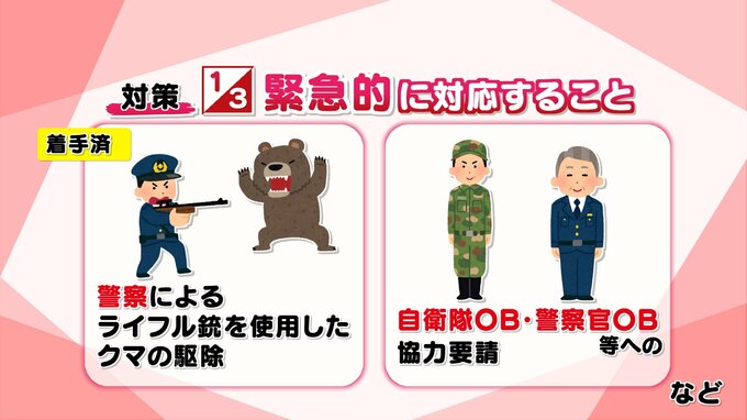 まず1つ目は「緊急的に対応すること」。例えば(1)警察によるライフル銃を使用したクマの駆除(2)自衛隊や警察のOBなどへの協力要請などがあります。