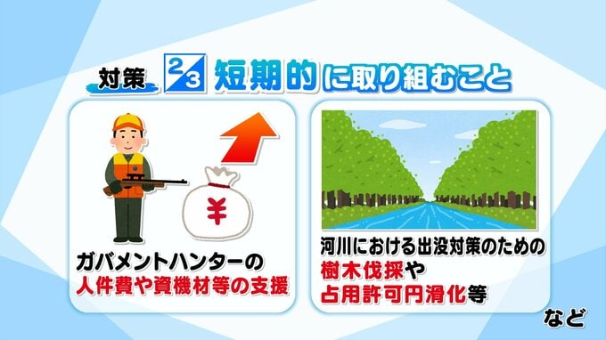 2つ目は、来年の春に向けて「短期的に取り組むこと」。(1)ガバメントハンター、いわゆる狩猟免許などを持ち、専門知識のある自治体職員の人件費や資材・機材などの支援を行うこと(2)河川における出没対策のための樹木伐採や「占用許可」=わななどを設置する場所の使用手続きを円滑化することなどです。