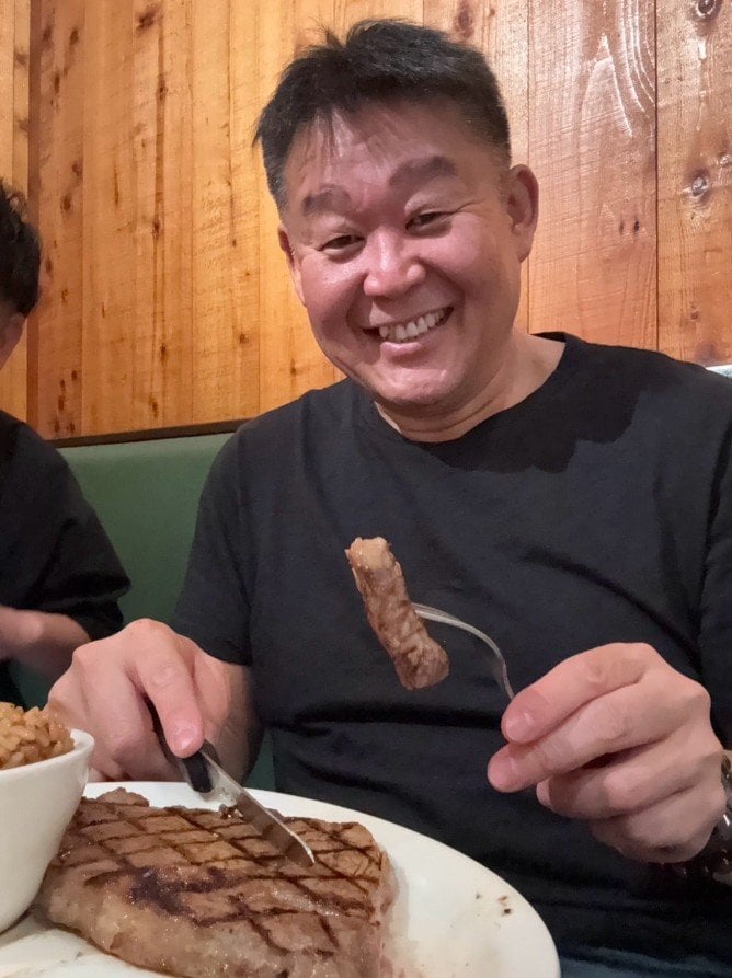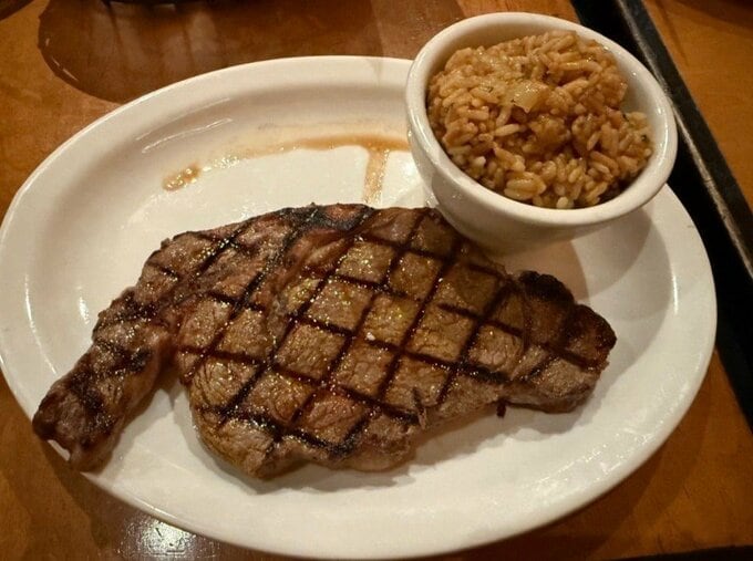 花田さんが公開した写真には、ボリューム満点の格子状の焼き目が鮮やかに入った厚切りのステーキが映っています。白い楕円形の皿に盛られたステーキの隣には、小さな器に入ったライスも添えられています。