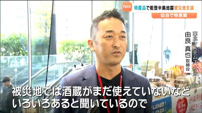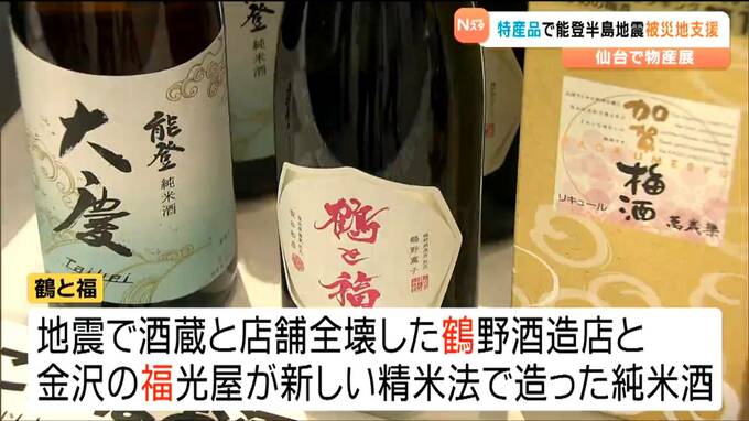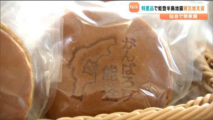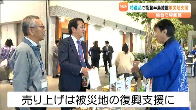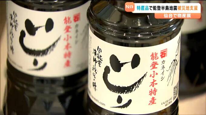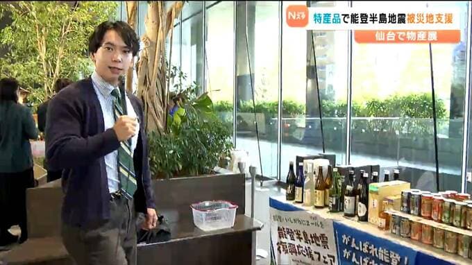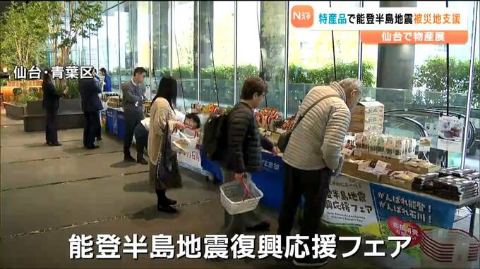 JR仙台駅前のオフィスビルのエントランスで開催された能登半島地震復興応援フェアでは、能登地方をはじめ、石川県内の特産品や輪島塗の箸といった工芸品など約70点が販売されました。