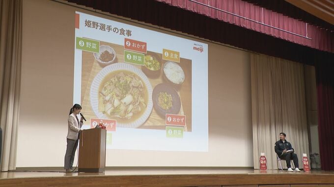 愛知県にある中部大学春日丘高校にやってきたのは、ラグビー トヨタヴェルブリッツの姫野和樹選手。食品メーカー「明治」の企画で、運動部の生徒を対象に栄養学の特別授業を行いました。