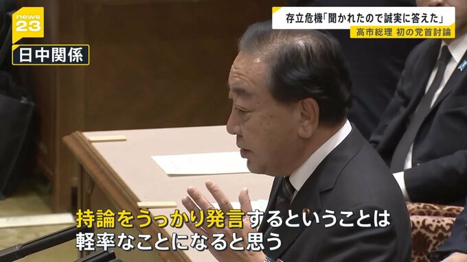 にこやかな笑顔で席についた総理ですが、立憲民主党の野田代表がまず質問したのは、“台湾有事”は“存立危機事態になり得る”とした高市総理の国会答弁についてです。