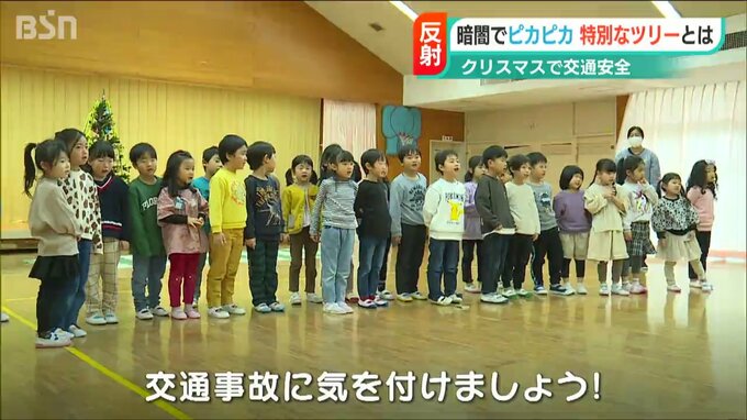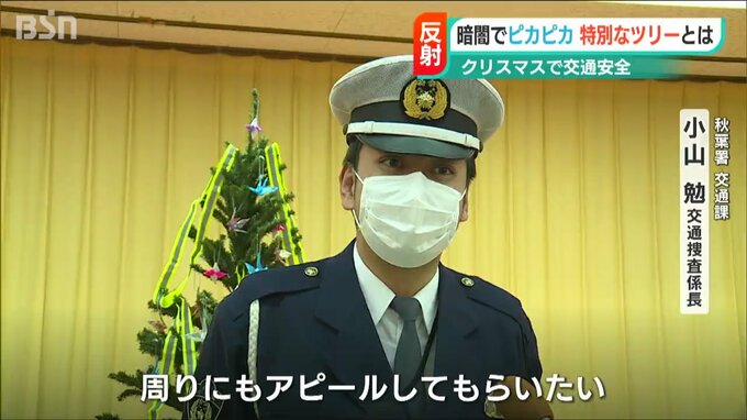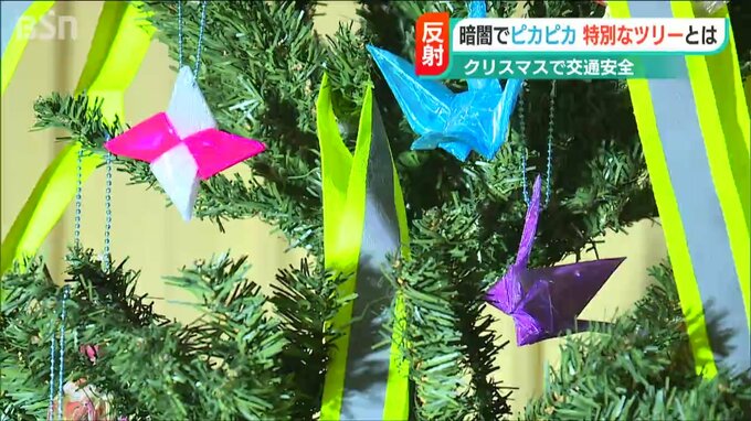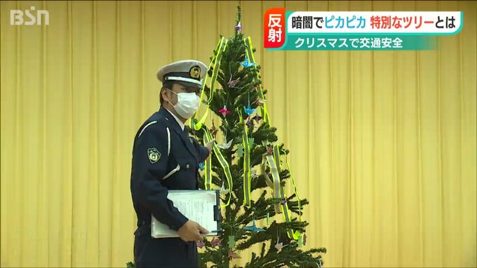 ツリーに飾り付けられているのは、たすきの形の反射材や反射材で折られた鶴など。新潟市秋葉区の秋葉警察署が交通事故の防止を呼び掛けようと、小須戸保育園に設置した特別なクリスマスツリーです。