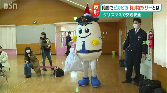 園児たちには、サンタに扮した新潟県警のマスコット「ひかるくん」からキーホルダー型の反射材がプレゼントされました。