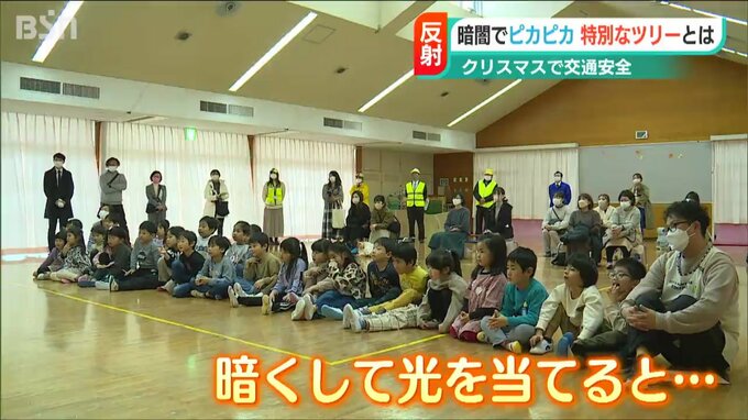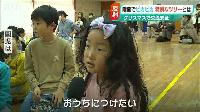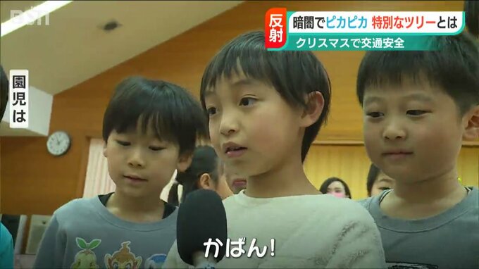 「いよいよクリスマス。こちらの保育園にはクリスマスツリーが飾られていますが、飾りつけは反射材です」