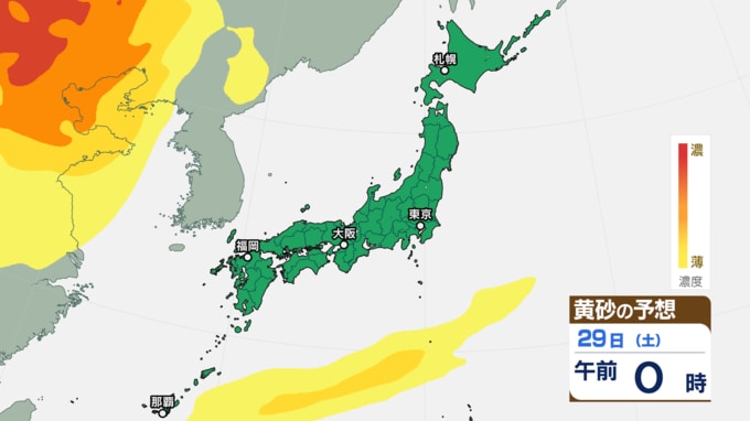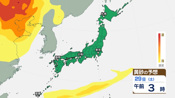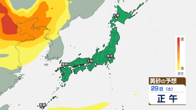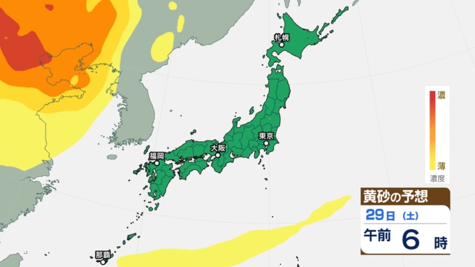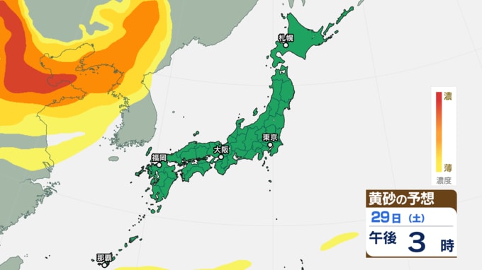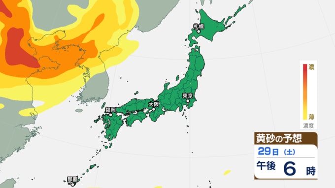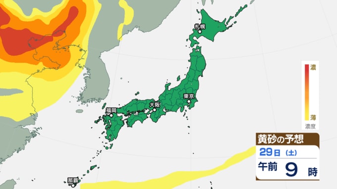 【黄砂情報】きょう(27日)午後から日本列島に黄砂飛来の見込み あす(28日)は東京にも飛来予測 27日~30日にかけての黄砂シミュレーション【気象庁 27日午前8時半更新】 RSK山陽放送 2025年11月27日(木) 08:30 国内 29日(土)の黄砂はどうなる? 29日(土)の黄砂のシミュレーションでは、【画像⑯~】のとおりです。 【画像⑯】 【画像⑰】 【画像⑱】 【画像⑲】 【画像⑳】 【画像㉑】 【画像㉒】 【画像㉓】