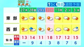 11月27日木曜日の宮城県内は、朝から青空が広がり、穏やかな一日のスタートを切りました。八木山上空では少し雲が出ているものの、基本的には青空が広がっています。明け方まで雲が多かったため、気温は大きく下が…