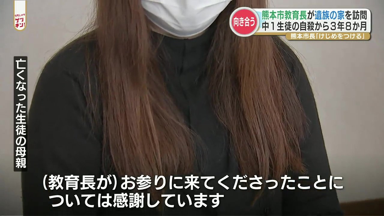小学校時代の元担任による不適切な指導が生徒の自殺に影響したとされる問題で、きょう12月13日、熊本市の教育長が遺影に手を合わせました。午後1時すぎ熊本市の遠藤 洋路(えんどう ひろみち)教育長は3年8か月前に自ら命を絶った男子生徒の自宅を訪れ、何度も頭を下げました。