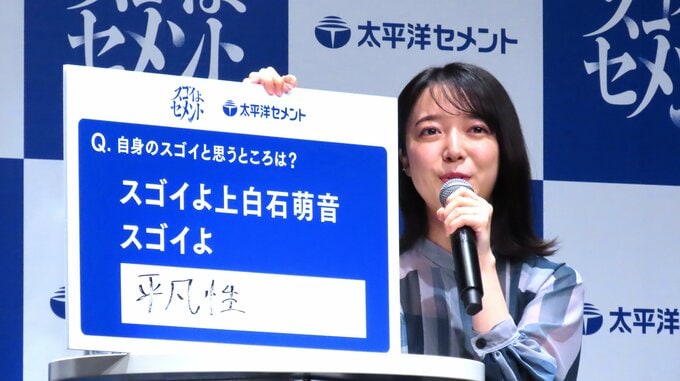 イベントでは、CMにちなんで『スゴイよ上白石萌音』を上白石さん自らが発表。フリップに『平凡性』と書くと、‟ご覧の通りの容姿と雰囲気ですので、街に出ても一切気づかれなくて、電車とかでも1回も気付かれたことがないので、得をしているなと思います。あまりにもありふれているので、行ったことがない場所でも見かけたと言われて、つい昨日の夜も言われました。セメントくらいどこにでもいます”と、イベントを絡めて自虐。