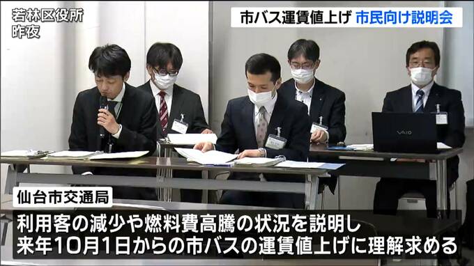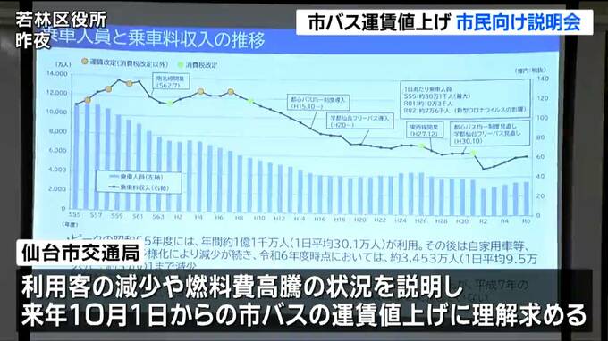 仙台市交通局は若林区役所で開いた説明会で、35年ほどで利用客が3分の1に減っていることや燃料費が高騰している状況を説明し、2026年10月1日から市バスの運賃を値上げすることについて市民に理解を求めました。