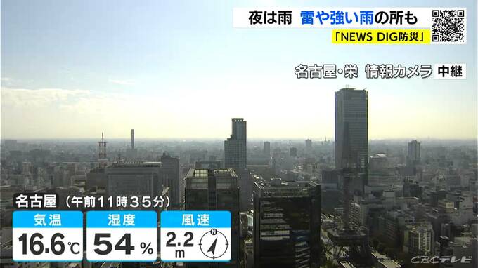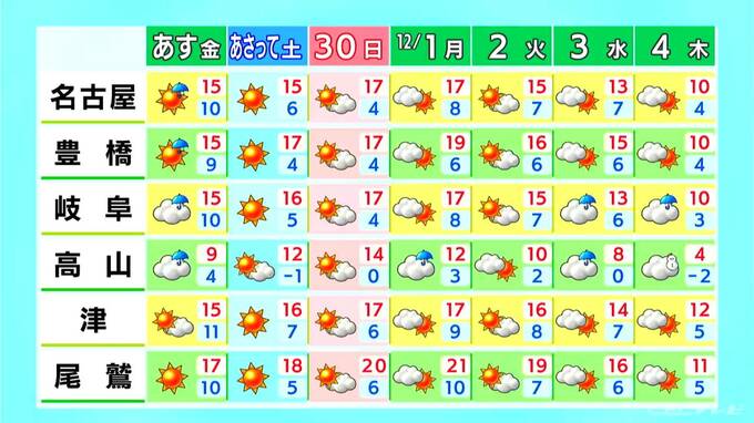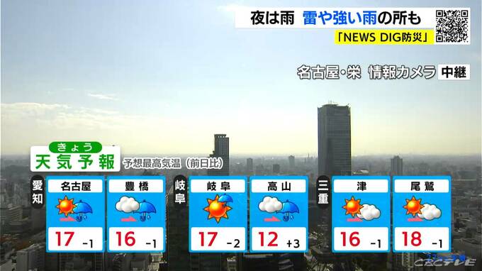 きょうの午後はゆっくり天気が下り坂で、夜は雨が降るでしょう。最高気温は名古屋や岐阜で17℃、高山で12℃の予想です。