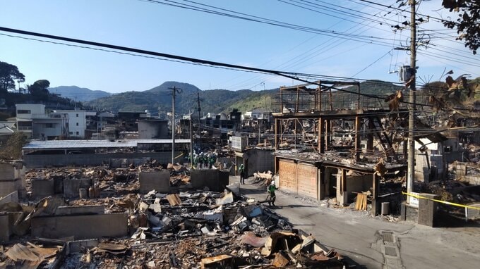 公開されたのは、火元とみられる住宅のある東側エリアです。一面、焼け落ちた建物や骨組みだけになった家が並び、火の勢いの激しさがわかります。また、建物の倒壊の危険度を判定し、張り紙の色で示す調査も進んでいます。